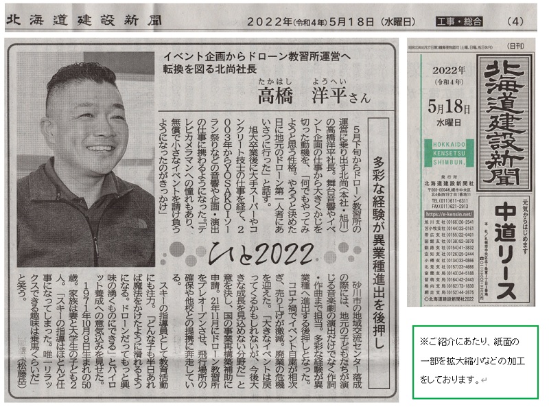 5月18日の北海道建設新聞でドローン教習所代表の高橋についてご紹介頂きました。